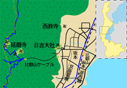 延暦寺・日吉社の門前町として、今も独特の風情をかもし出す坂本。その歴史は延暦寺とともに刻まれてきました。延暦寺は、日本仏教の一大拠点として多くの高僧を輩出するとともに、仏教美術をはじめとする宗教文化を発信してきました。その一方で、多数の荘園を抱え、経済活動も活発でありました。このため坂本では、室町時代に運送業者の馬借(ばしゃく)や車借(しゃしゃく)、金融業者の土倉(どそう)が活躍しています。しかし、元亀2年(1571)、織田信長の山門焼き打ちによって、大きな被害をこうむります。その後、豊臣秀吉の時代に復興し、江戸時代には延暦寺5,000石の門前町となりました。